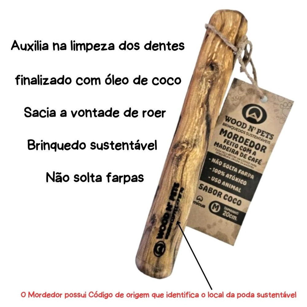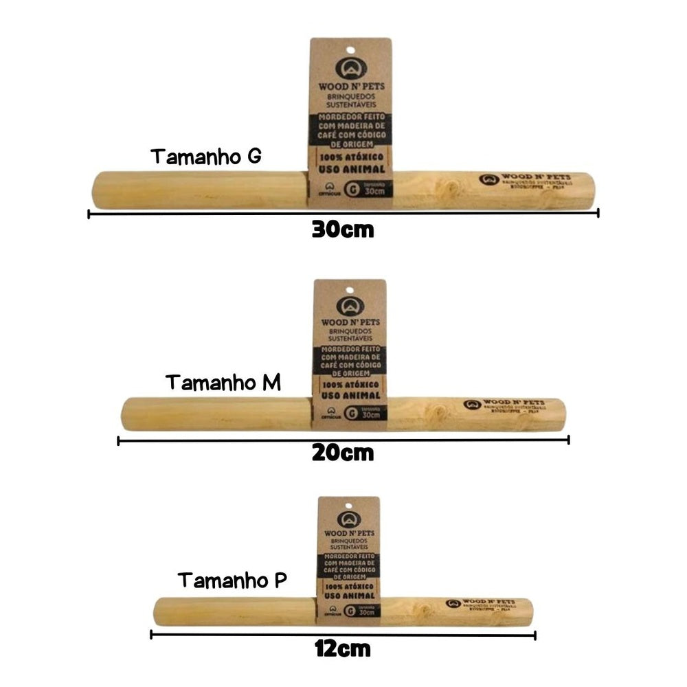 Brinquedo sustentável de madeira do café, Cada Unidades possui umCódigo de origem que identifica o local da poda sustentável;Wood n Pet Stick é finalizado com óleo de coco que faz bem à saúde do cão e é um chamariz para a brincadeira; Caracteristicas Não solta farpas; As fibras são celulose que ajudam na digestão do cão; Auxilia na limpeza dos dentes; Sacia a vontade de roer Com Óleo de Coco Dimensões do Produto Tamanho P: 12cm Tamanho M: 20cm Tamanho G: 30cm