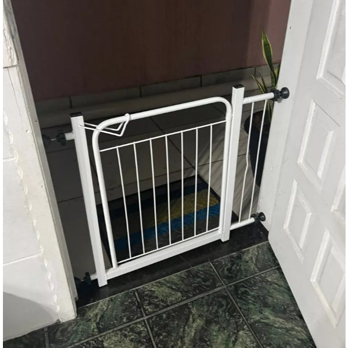 Observações Iniciais: Você pode utilizar o portão em duas opções de vãos: - Portão sem extensor: 69 cm à 74 cm - Portão com o extensor de 10 cm: 79 cm à 84 cm Indicado para: cães de pequeno, médio porte, e também para crianças. Não possui cantos vivos na estrutura o que promove mais segurança a seu bebe. Características Gerais: - Estrutura tubular reforçada; - Pintura com tinta epóxi a pó; - Instalação rápida e MUITO FÁCIL sem danos às paredes e sem furos; - Trava se segurança (evita que seu bebê ou cão abra com facilidade); - Abre para Ambos os Lados. Dimensões do Produto: - Altura 69 cm; - Largura:84 cm Sem Extensor (69 a 74cm) Com Extensor (79 a 84cm) - Distância entre as grades: 5 cm.