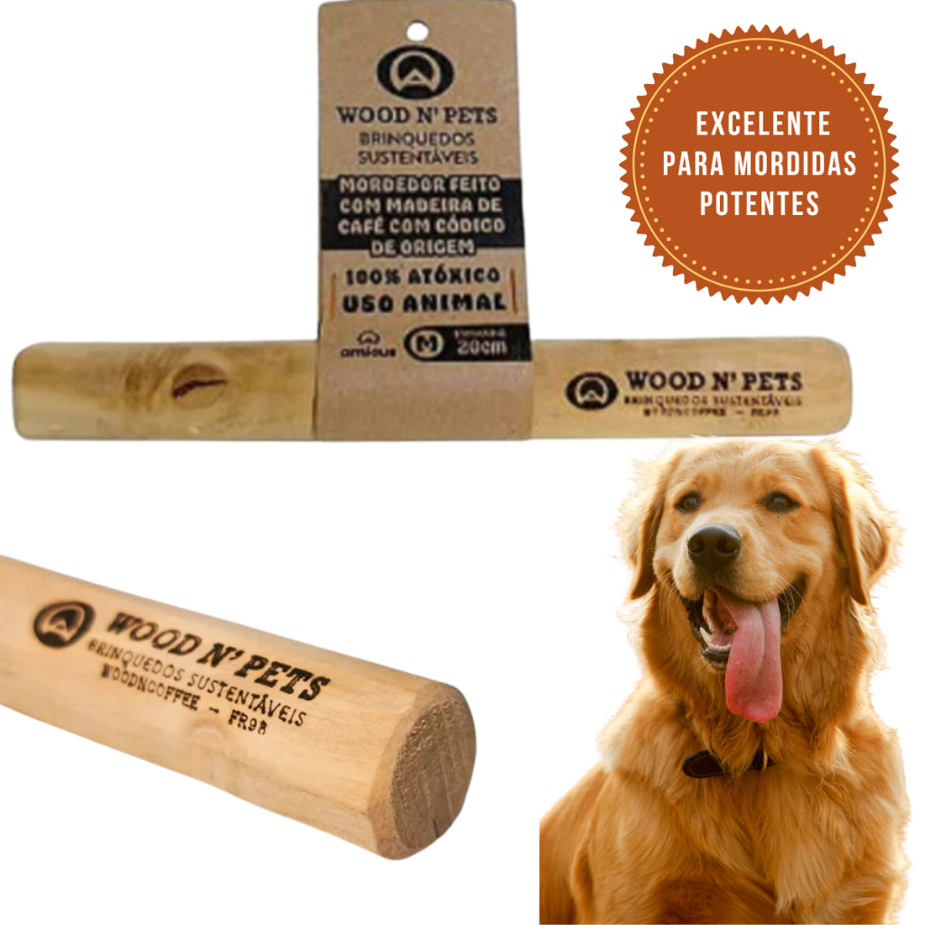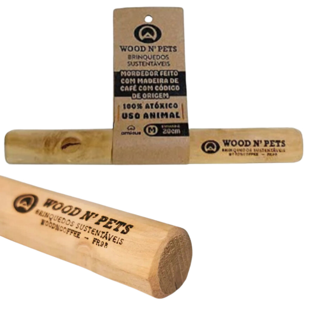 O brinquedo WOOD N’ PETS é feito de madeira do café com código de origem que permite identificar de onde a madeira foi retirada de forma sustentável, pois após alguns anos os pés de café precisam ser podados. A madeira do café é ideal, pois é fibrosa, MAS POR SE TRATAR DE UM PEDAÇO DE MADEIRA PODE SIM SOLTAR PEQUENOS PEDAÇOS, POR ISSO SEMPRE OFEREÇA AO PET COM SUPERVISÃO. As fibras são celulose que ajudam na digestão do cão e limpeza dos dentes. O WOOD N’ PETS STICK é ideal para brincar com seu cão, saciando sua vontade de roer. O brinquedo WOOD N’ PETS é finalizado com óleo de coco, que além de fazer bem a saúde dos cães é um chamariz para a brincadeira.