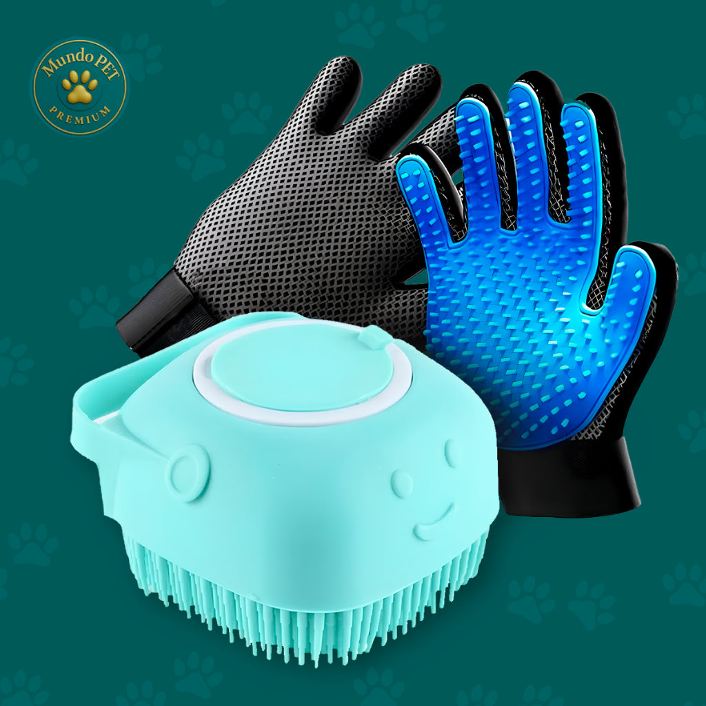 KIT LIMPEZA PET LUVA NANO TIRA PELO + ESCOVA MASSAGEADORA LAVA PET COM DISPENSER