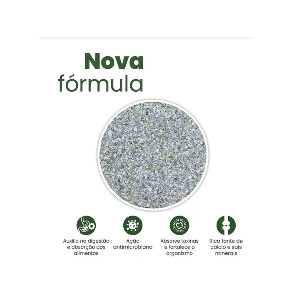 Carbonato de cálcio, argila vermelha, conchas de ostras, pedriscos, alga marinha calcária, orégano desidratado e carvão vegetal ativado.